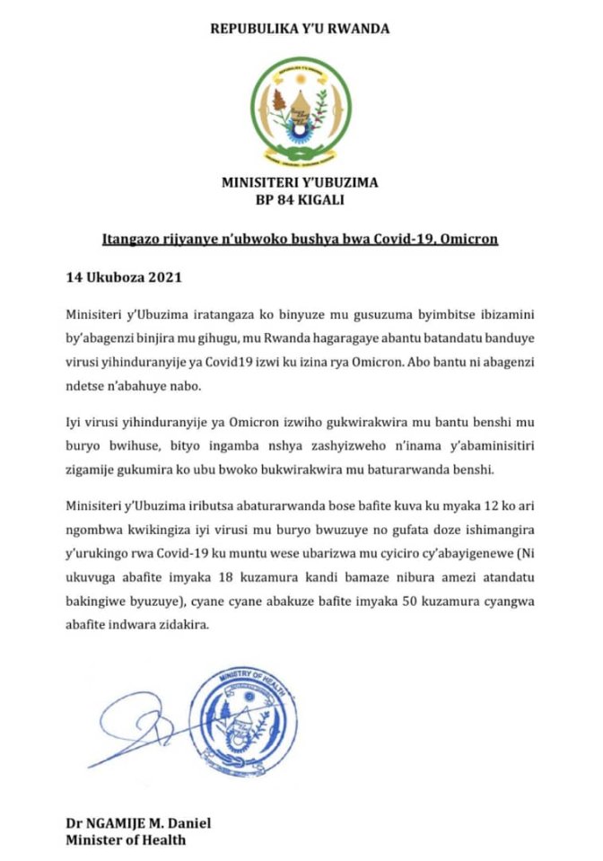 Ni itangazo ryasohotse kuri kuri uyu wa Kabiri tariki ya 14 Ukuboza, rihamagarira Abanyarwanda n’abaturarwanda gushishikarira kwikingiza guhera ku bafite imyaka 12 kuzamura no gusaba abafite imyaka 18 kuzamura kwikingiza urukingo rwa Gatatu rushimangira izo bahawe mbere.