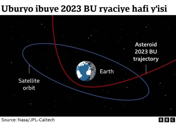Ni urubuye runini rwa Asteroid, rizwi nka 2023 BU, rifite ubunini nk’ubw’imodoka ya minibus, ryaciye iruhande rw’umugabane wa Amerika y’epfo mbere gato ya saa 00:30 ku isaha ngengamasaha ya GMT, hari saa 02:00 z’igicuku.