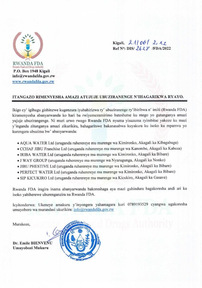 FDA iragira inama Abanyarwanda bari basanzwe bakoresha aya mazi guhindura bagakoresha ari ku isoko yabiherewe uburenganzira na Rwanda FDA.