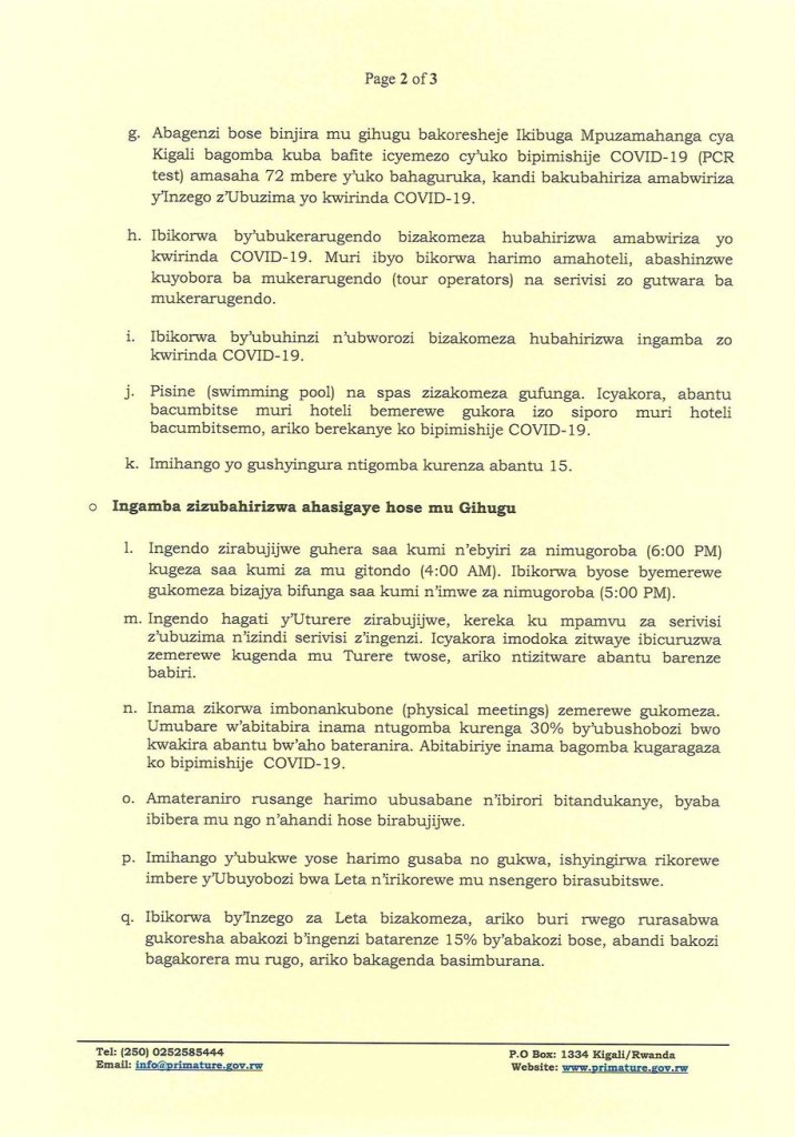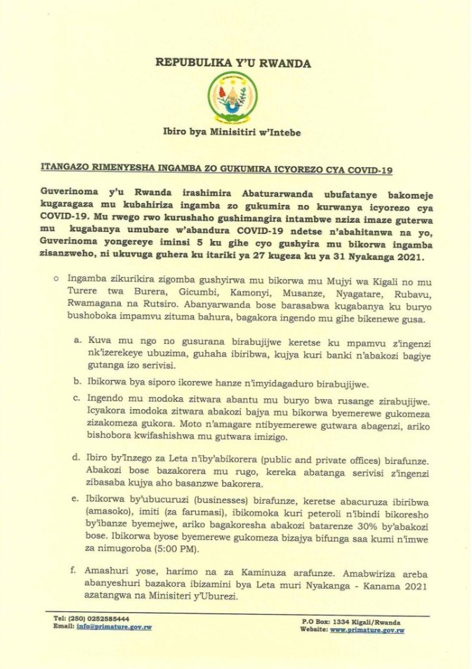 Itangazo riturutse mu biro bya Minisitiri w’Intebe w’u Rwanda kuri iki cyumweru Tariki 25 Nyakanga 2021, riravuga ko ku ngamba zisanzwe za Guma mu rugo mu Mujyi wa Kigali no mu turere umunani, hongeweho iminsi itanu nk’igihe cyo gushyira mu bikorwa ingamba zisanzweho.