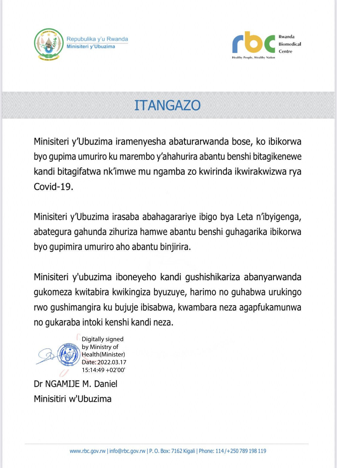 Mu itangazo rya Minisiteri y’ubuzima handitsemo ko , icyakora, bikiri ngombwa ko abantu bikingiza icyorezo COVID-19 kuko cyo kigihari.