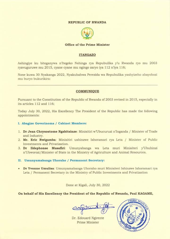 Ku mugoroba wo kuri uyu wa Gatandatu, tariki ya 30 Nyakanga 2022, Perezida Paul Kagame yashyizeho Minisiteri Ishinzwe ishoramari rya Leta, anasimbuza abandi bayobozi mu zindi minisiteri.