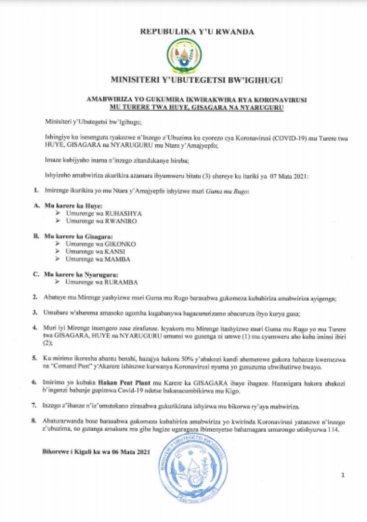 Minisiteri y’Ubutegetsi bw’igihugu, (Minaloc) yatangaje ko imirenge itandatu yo mu turere twa Huye, Nyaruguru na Gisagara yashyizwe muri Guma mu rugo nyuma y’ubwiyongere bukabije bw’abandura Coronavirus.
