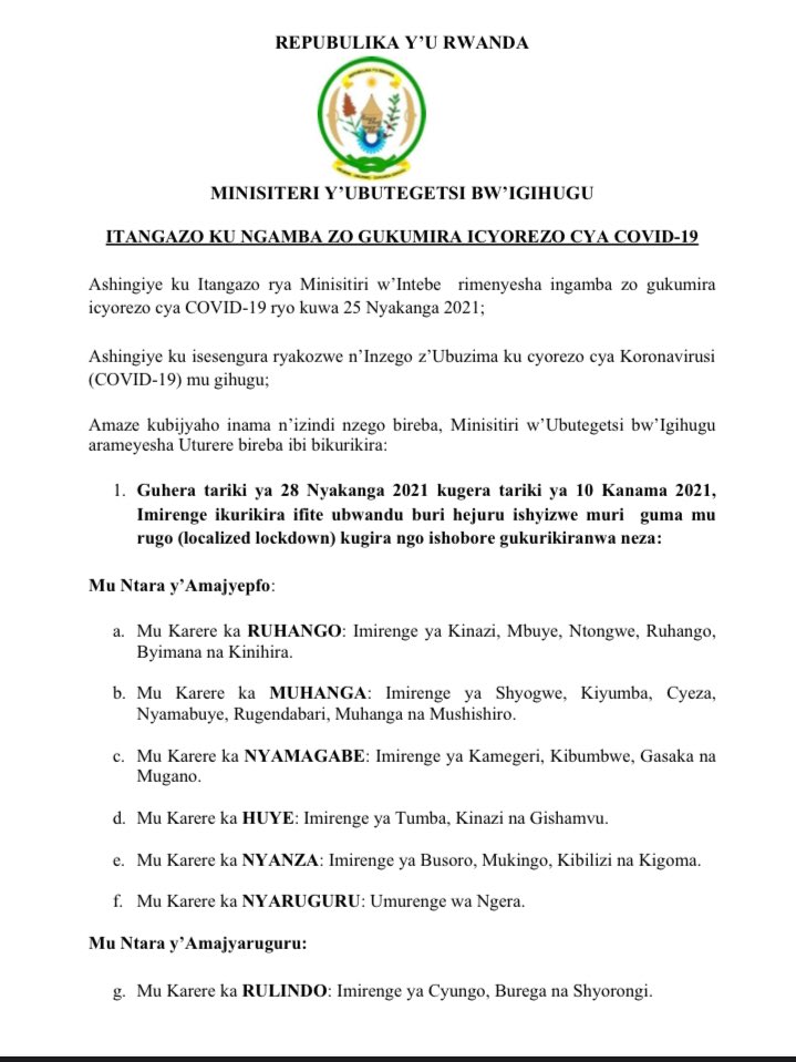 2. Abatuye mu Mirenge ivugwa muri iri tangazo barasabwa kubahiriza amabwiriza akubiye mu itangazo rya Minisitiri w’lntebe rivugwa haruguru akurikizwa mu Mujyi wa Kigali n’Uturere 8 twashyizwe muri gahunda ya Guma Mu Rugo.