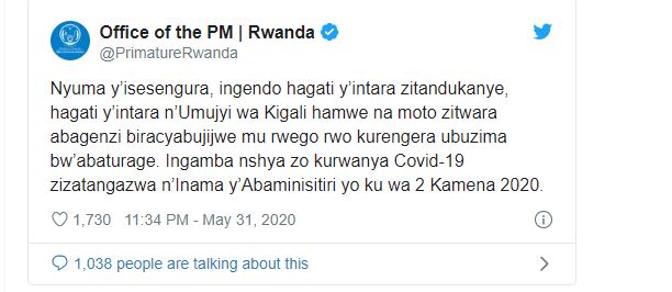 biro bya Minisitiri w’Intebe mu Rwanda biratangaza ko nyuma y’isesengura, ingendo hagati y’Intara zitandukanye, ingendo hagati y’Intara n’Umujyi wa Kigali hamwe n’ingendo za moto zitwara abagenzi zikomeza gusubikwa.