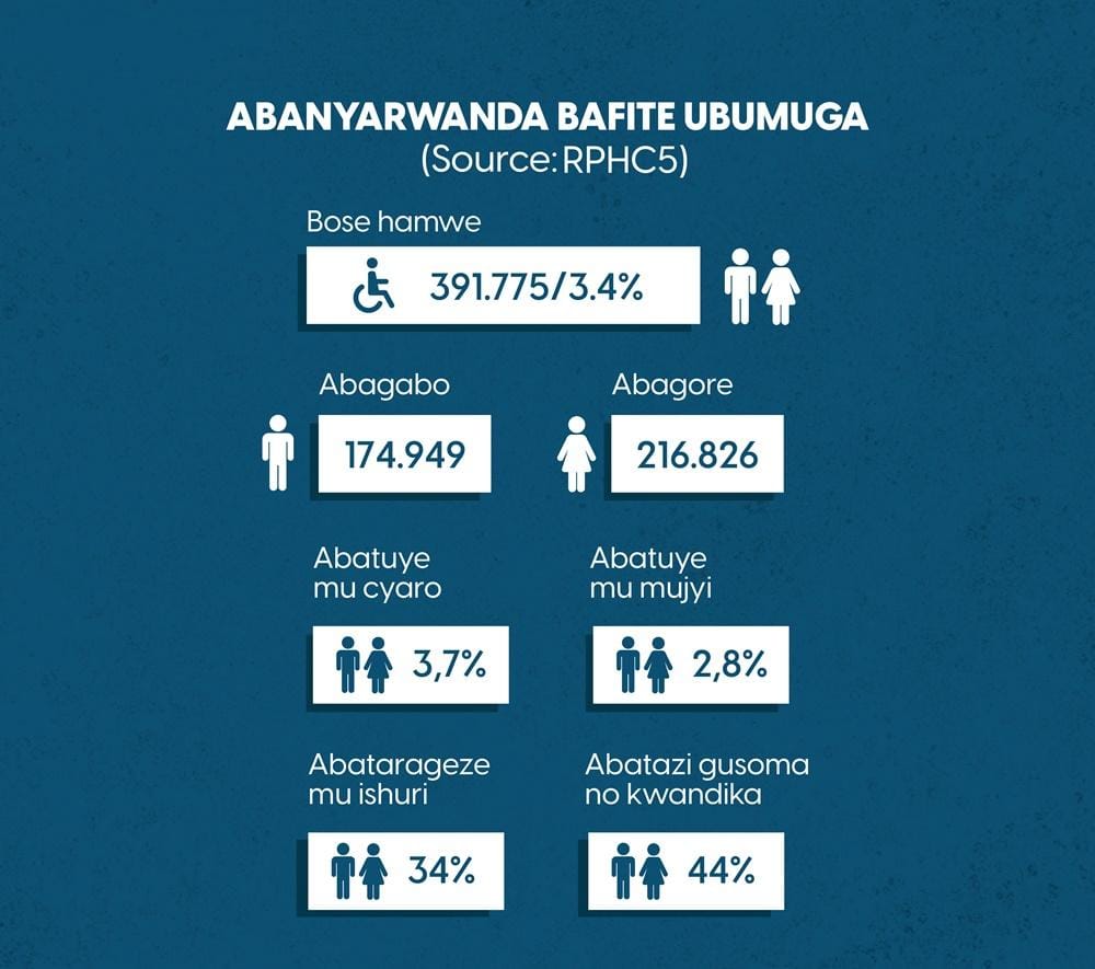 Hashingiwe ku byavuye muri iryo barura, byerekana ko abantu bafite ubumuga mu Rwanda bagera ku 391.775 ku baturage bose bangana na miliyoni 13 zisaga, ni ukuvuga ko ari 3,4%. Abagore ni 216.826 mu gihe abagabo bagera kuri 174.949.