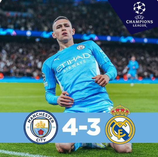 Ikipe ya Manchester City yatsinze Real Madrid ibitego 4-3 mu mukino ubanza wa Champions League wabereye mu gihugu cy’u Bwongereza, umukino wabonetsemo ibitego birindwi.