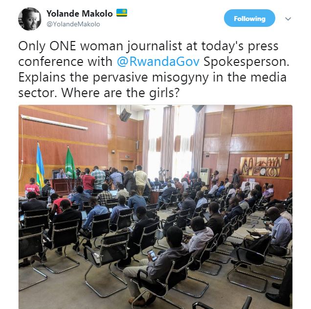 Mu kiganiro cyahuje abanyamakuru na Minisitiri w’Ububanyi n’Amahanga w’u Rwanda, Louise Mushikiwabo, muri Werurwe 2018, Yolande Makolo yibajije impamvu cyagaragayemo umunyamakuru umwe w’igitsinagore.