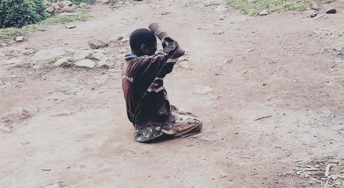 Bitewe nuko uyu mwana akurura ikibuno hasi, iyo imvura iguye iramunyagira mu gihe ababyeyi be baba bagiye guca inshuro.