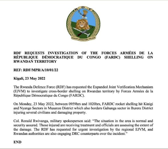 Mu itangazo ryasohowe n’Igisirikare cy’u Rwanda, RDF cyemeje aya makuru ndetse kivuga ko benshi mu baturage bakomerekejwe n’ibi bisasu ndetse bikangiriza n’imitungo yabo.