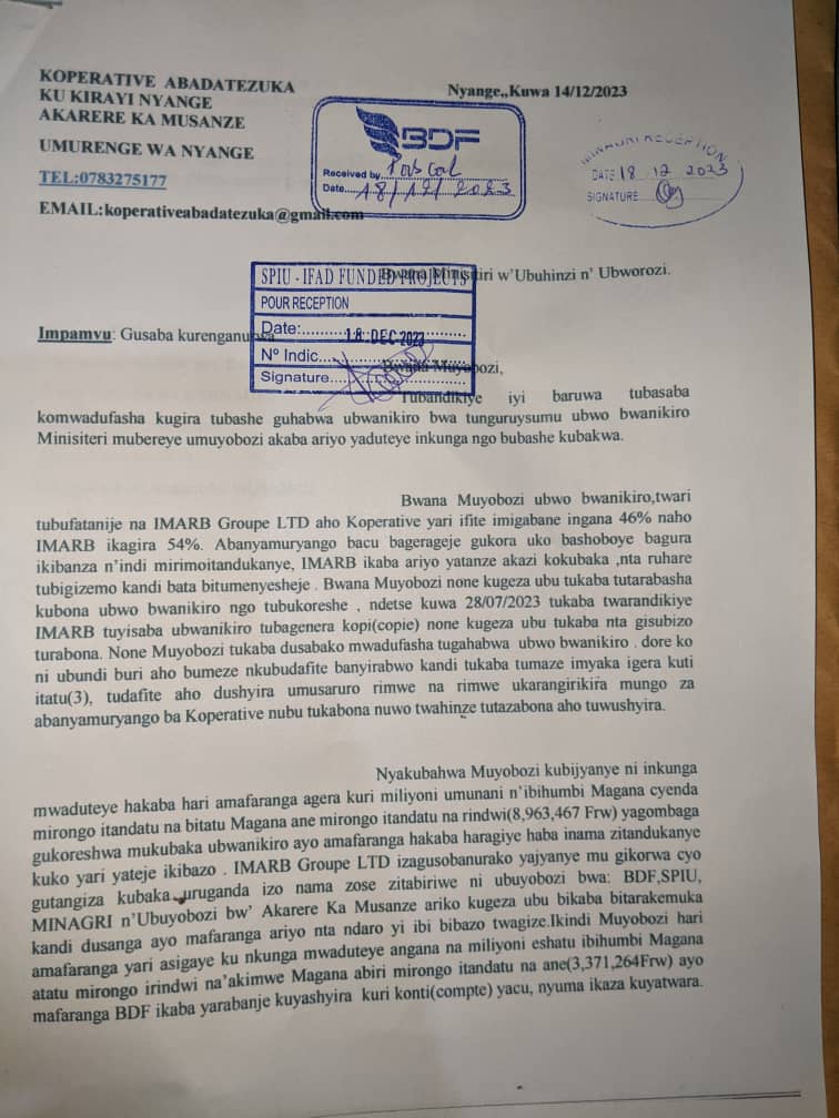 Ikindi abanyamuryango b’izi koperative bibaza MINISITERI Y’UBUHINZI N’UBWOROZI idashaka kubahaho amakuru ni ukumenya niba hari icyo bashoboara gukora kugira ngo basubizwe amafaranga agera kuri miliyoni hafi 200 zakuwe kuri konte za kampani za joint venture mu buryo budasobanutse agasubizwa muri leta nyuma yuko BDF isanze IMARB itarakoreshaje neza inkunga yayigeneye bigatuma na koperative zamburwa ayo mahirwe.