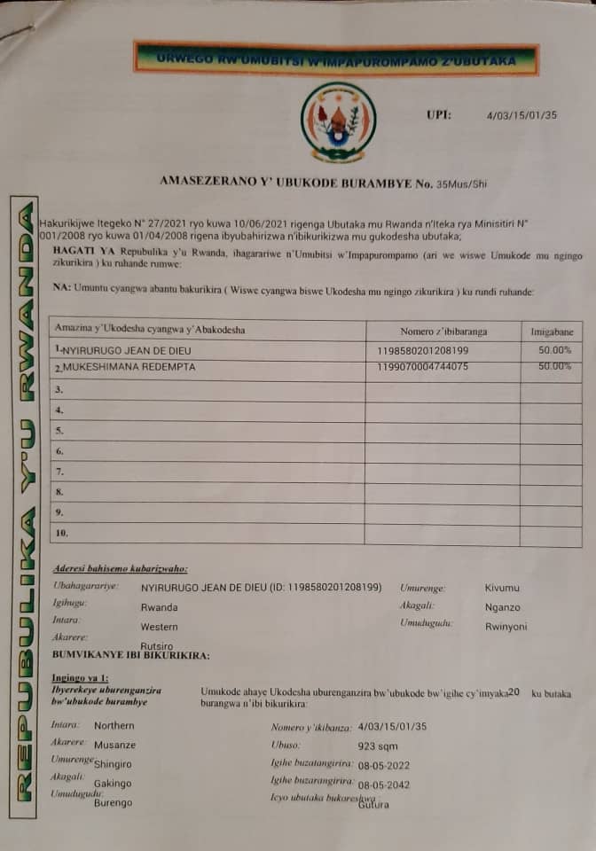 Ati: "Mfite icyangombwa cy’ubutaka kigaragaza ko ahantu isambu yanjye iri mu kagari Karengo, umudugudu wa Burengo hagenewe gutura, ikindi muri uyu mudugudu leta irimo kuhubakira abatishoboye muri (Human security) ariko natunguwe no kubwirwa ko barimo kunsenyera inzu ntahari, nkaba nsaba kurenganurwa."