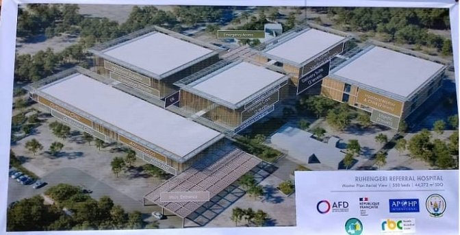 Ati: "Kuri ya Nguzanyo y’amafaranga y’u Bufaransa ubushobozi bwarabonetse, hatangiye gahunda yo gutanga amasoko niyo irimo, (Rwanda housing Authority) niyo ibifite mu nshingano irimo iratanga amasoko, kiriya twerekanaga buriya mu byukuri ntabwo twavuga ko cyari igishushanyo mbonera, ahubwo cyerekanaga aho inyubako z’ibitaro zizaba ziherereye, urebye niyo gahunda yatangiye, uyu mwaka ntacyizere cyo gutangira kubaka ahubwo umuntu yabibarira mu mwaka utaha wa 2025, ubushobozi nibwo bwari ikibazo abaturage bagomba kugira icyizere ko ibitaro byo bagomba kubibona bishya kandi bimeze nez."