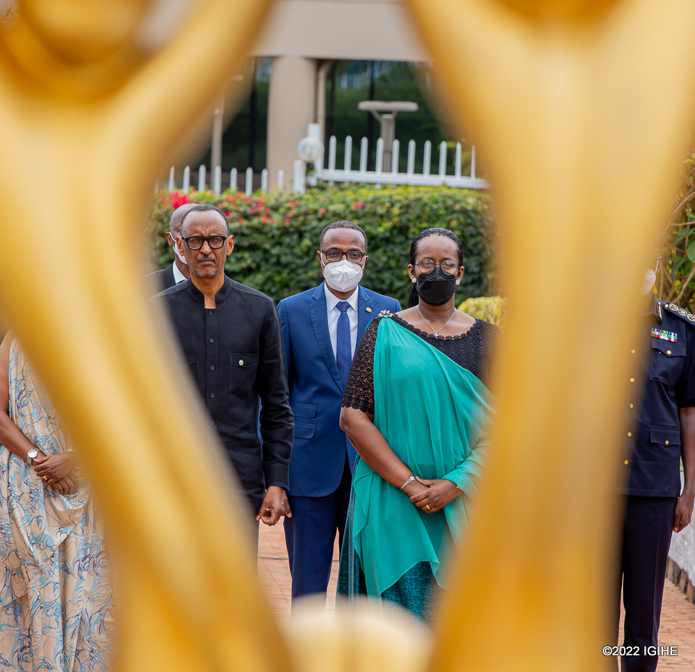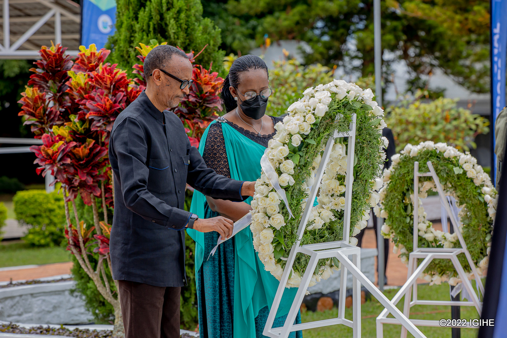 Perezida Paul Kagame na Madamu Jeannette Kagame bunamiye Intwari z’u Rwanda anashyira indabo ku Gicumbi cy’Intwari giherereye i Remera mu Mujyi wa Kigali.