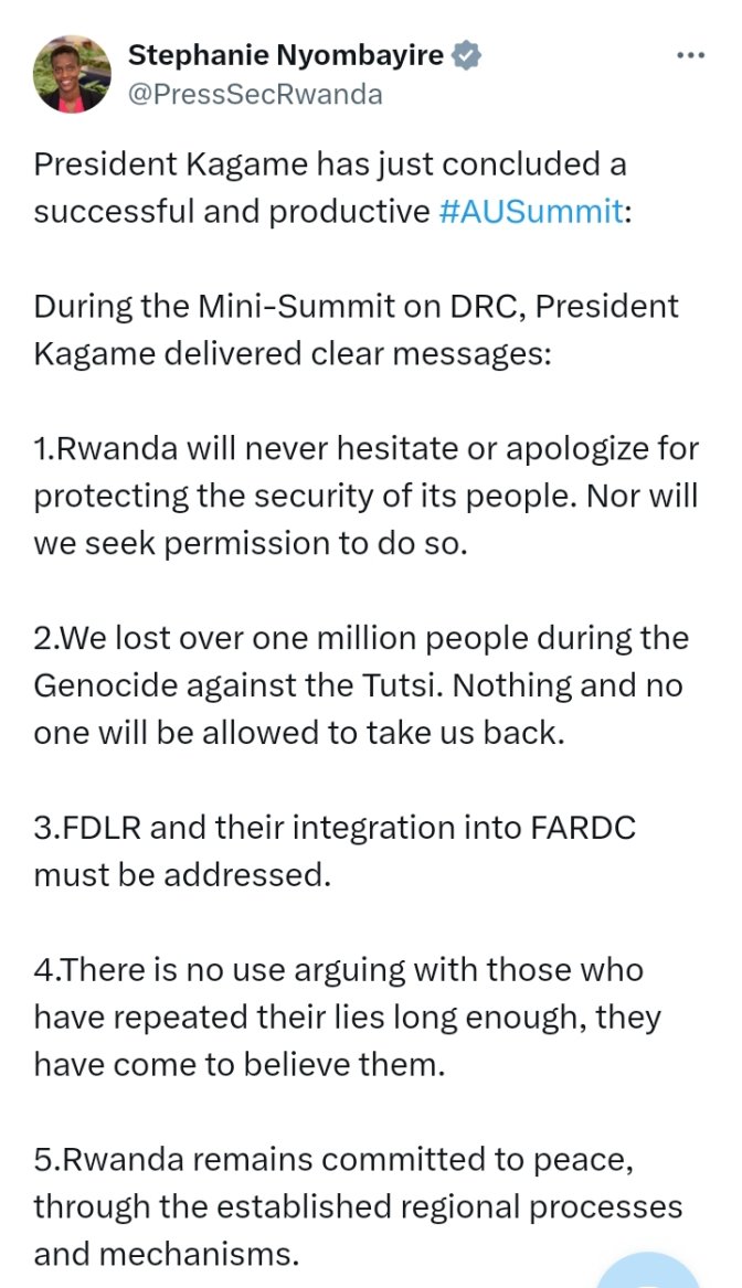 Byatangajwe mu butumwa mugufi bwashyizwe ku rukuta rwa X n’Umuvugizi wa Perezidanse y’u Rwanda, Stephanie Nyombayire.