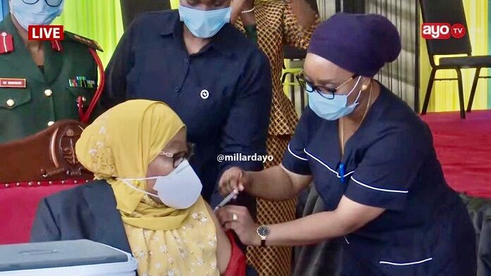 Bitandukanye na Perezida Magufuli yasimbuye, Perezida wa Tanzania, Samia Suluhu yeretse urugero abatuye Tanzania yikingiza urukingo rwa COVID-19 imbere y’abaturage.