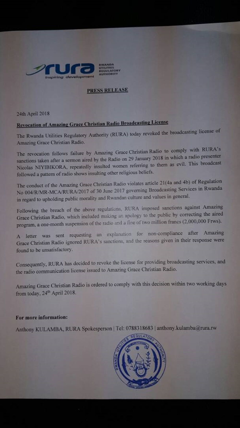 Itangazo RURA yasohoye kuri uyu wa 24 Mata 2018 rigira riti “Urwego Ngenzuramikorere, RURA, uyu munsi rwambuye Amazing Grace Radio icyangombwa cy’isakazamakuru.”