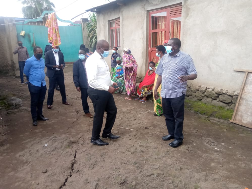 Minisitiri Gatabazi, (iburyo), ari gusura abaturage inzu zabo zangijwe n’imitingito ikomeje kugera i Rubavu ikurikira iruka ry’Ikirunga cya Nyiragongo