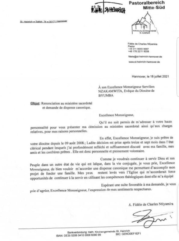 Ibaruwa y’ubwegure bwe yandikiwe Musenyeri wa Diyosezi ya Byuma, akoreramo, Nzakamwita Servilien, ku wa 18 Nyakanga 2021, wari umushinzwe kuva mu 2008.