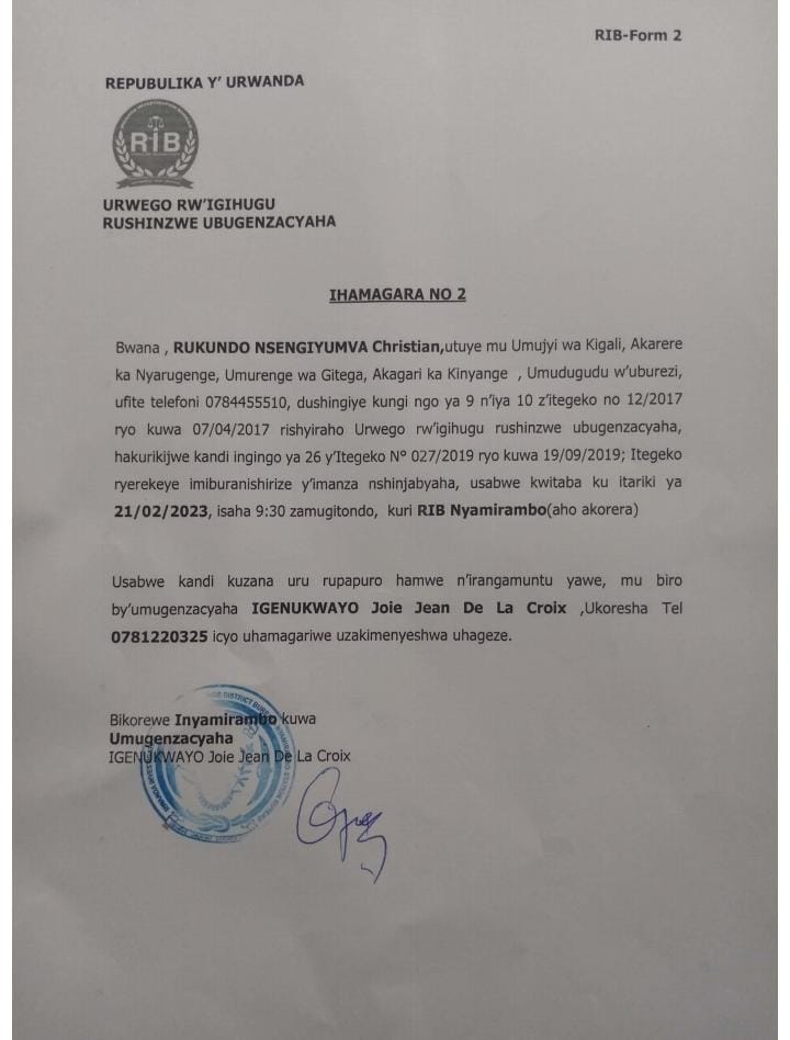 Mu makuru mamaurwagasabo ifitiye gihamya ni uko Chriss Eazy yahamagajwe n’urwego rw’Igihugu ry’ubugenzacyaha (RIB ) ku nshuro ya Kabiri ko agomba kwitaba tariki ya 21 Gashyantare 2023 saa 9h30’ za mugitondo i Nyamirambo mu biro by’ubugenzacyaha.