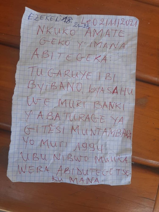Ku rubuga nkoranyambaga rwa Twitter hari gucicikana amafoto n’ibaruwa yanditswe n’umuturage utaratangazwa amazina wagaruriye Banki y’abaturage ishami ryo muri Karongi ibikoresho by’intebe yavuze ko yasahuye iyo Banki mu gihe cya Jenoside mu 1994.