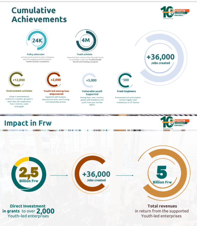 Youth Connekt yafashije benshi mu rubyiruko kuko yatumye hahangwa imirimo igera ku bihumbi 36, hamaze kandi gukorwa ibikorwa bigera muri miliyoni 4 byakorewe ahantu hatandukanye mu gihugu bikozwe mu bumenyi bw’urubyiruko rutanga umusanzu mu bikorwa bitandukanye by’abaturage.