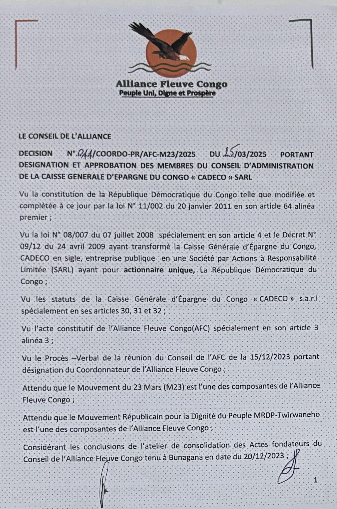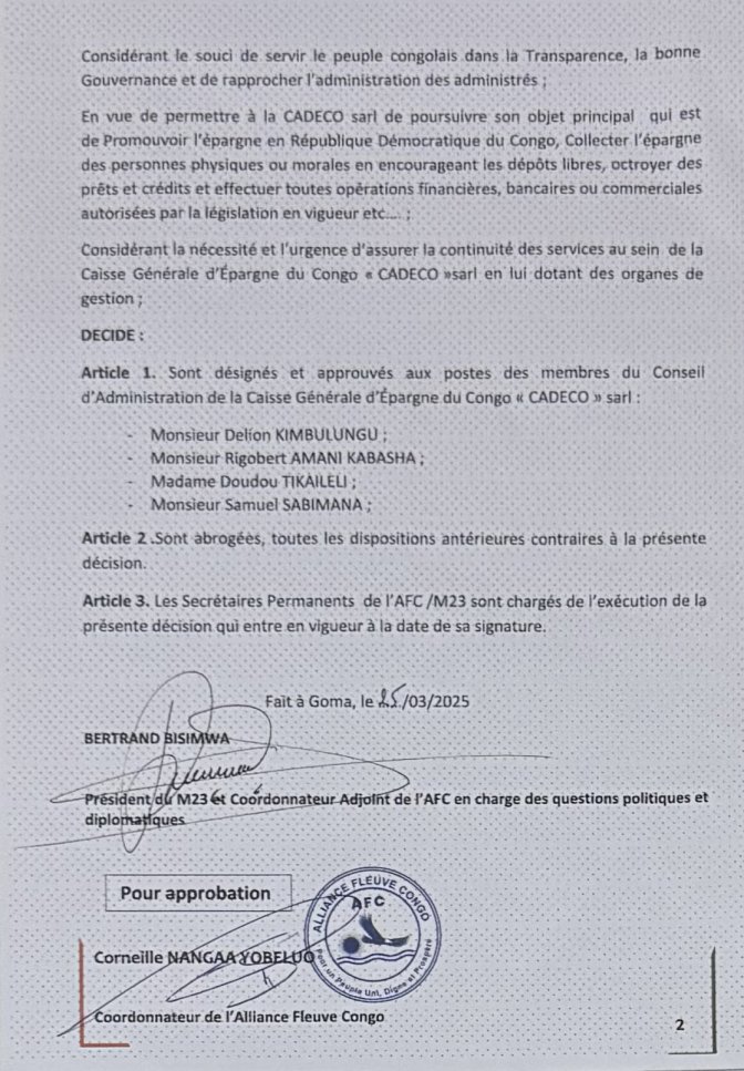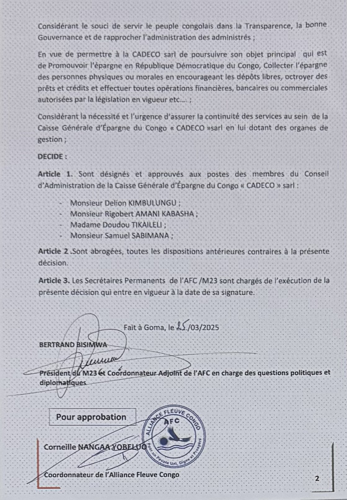 Byatangajwe binyuze ku rukuta rwa X rw’umuvugizi wa AFC/M23 mu rwego rwa Politiki, Lawrence Kanyuka, aho yashyize hanze urutonde rw’amazina y’abayobozi b’iki kigo cy’imari bashyizweho.
