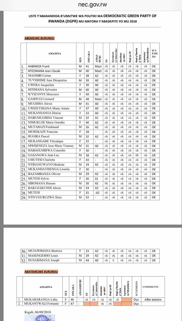 Mu bafite ubumuga hatanzwe kandidatire 10 zose ziremerwa, mu bifuza guhagararira abagore hemejwe abakandida 179.Muri abo bagore harimo 23 bo mu Majyaruguru, 62 bo mu mayepfo, 39 Iburasirazuba, 39 Iburengerazuba na 16 bo mu mujyi wa Kigali.Tubibutse ko ibikorwa byo kwiyamamaza bizatangira ku wa 13 Kanama kugeza ku wa 1 Nzeri 2017.