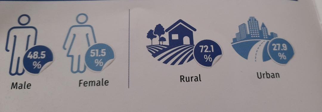 Kugeza ubu u Rwanda rugizwe n’ingo 3,312,743 muri bo igitsina gabo ni 48.5% mu gihe abagore bari kuri 51.5% , umubare w’abaturage batuye mu cyaro baracyari hejuru cyane kuko bari kuri 72.1, mu gihe abatuye mu mujiyi bakiri bake cyane ugereranyije kuko bageze kuri 29.7 bigaragara ko urugendo rukiri rurerure.