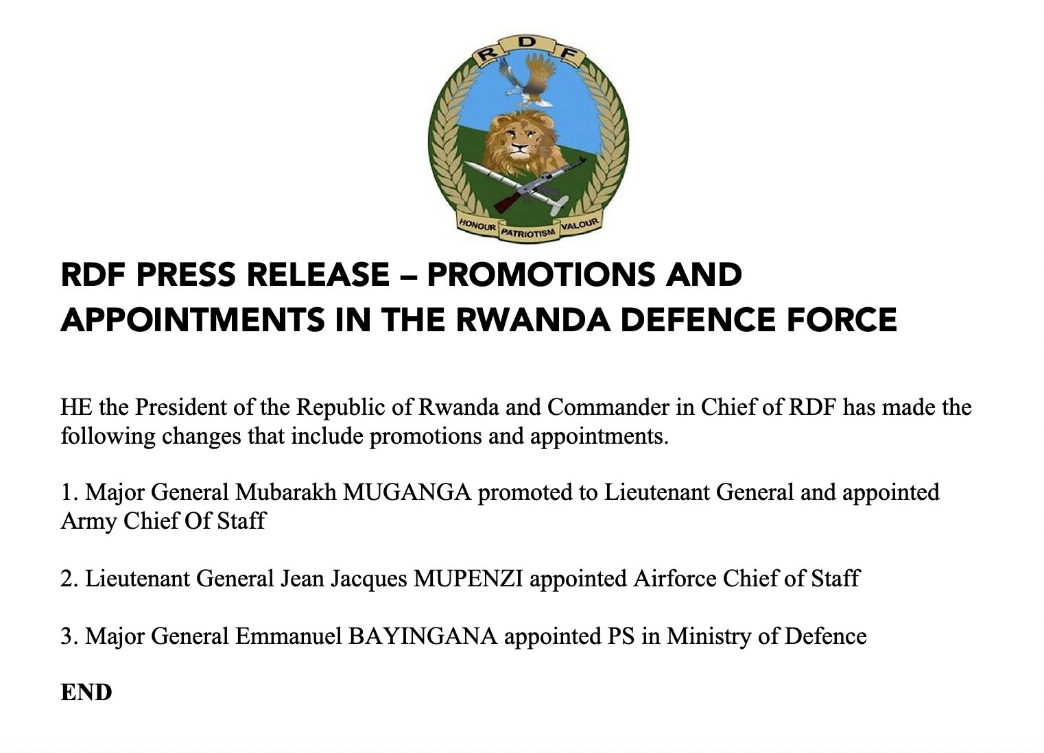 Minisiteri y’Ingabo z’u Rwanda yatangaje amazina y’Abasirikare bakuru batatu mu ngabo z’u Rwanda bazamuwe mu ntera banahabwa inshingano nshya.