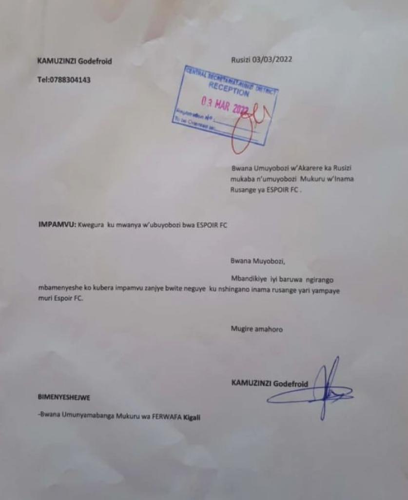 Mu gitondo cyo kuri uyu wa Kane tariki ya 3 Werurwe 2022, nibwo inkuru yabaye kimomo ko uwari Perezida w’ikipe yo mu karere ka Rusizi "Espior Fc" witwa Kamuzinzi Godefroid yongeye yafashe icyemezo cyo kwegura ku mpamvu ze bwite.