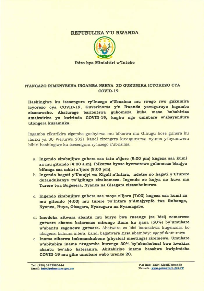 Ibyemezo bya Guverinoma byatangajwe kuri uyu wa Mbere tariki ya 29 Werurwe 2021, bizatangira kubahirizwa kuri uyu wa kabiri tariki ya 30 Werurwe 2021.