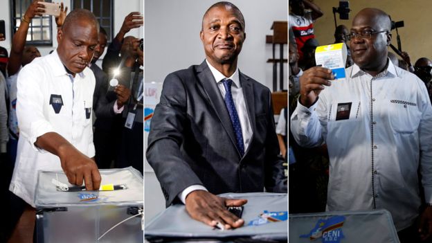 Abakandida batavuga rumwe na leta Martin Fayulu (i bumoso) na Felix Tshisekedi (i buryo) bari bahanganye na Emmanuel Shadary (hagati)