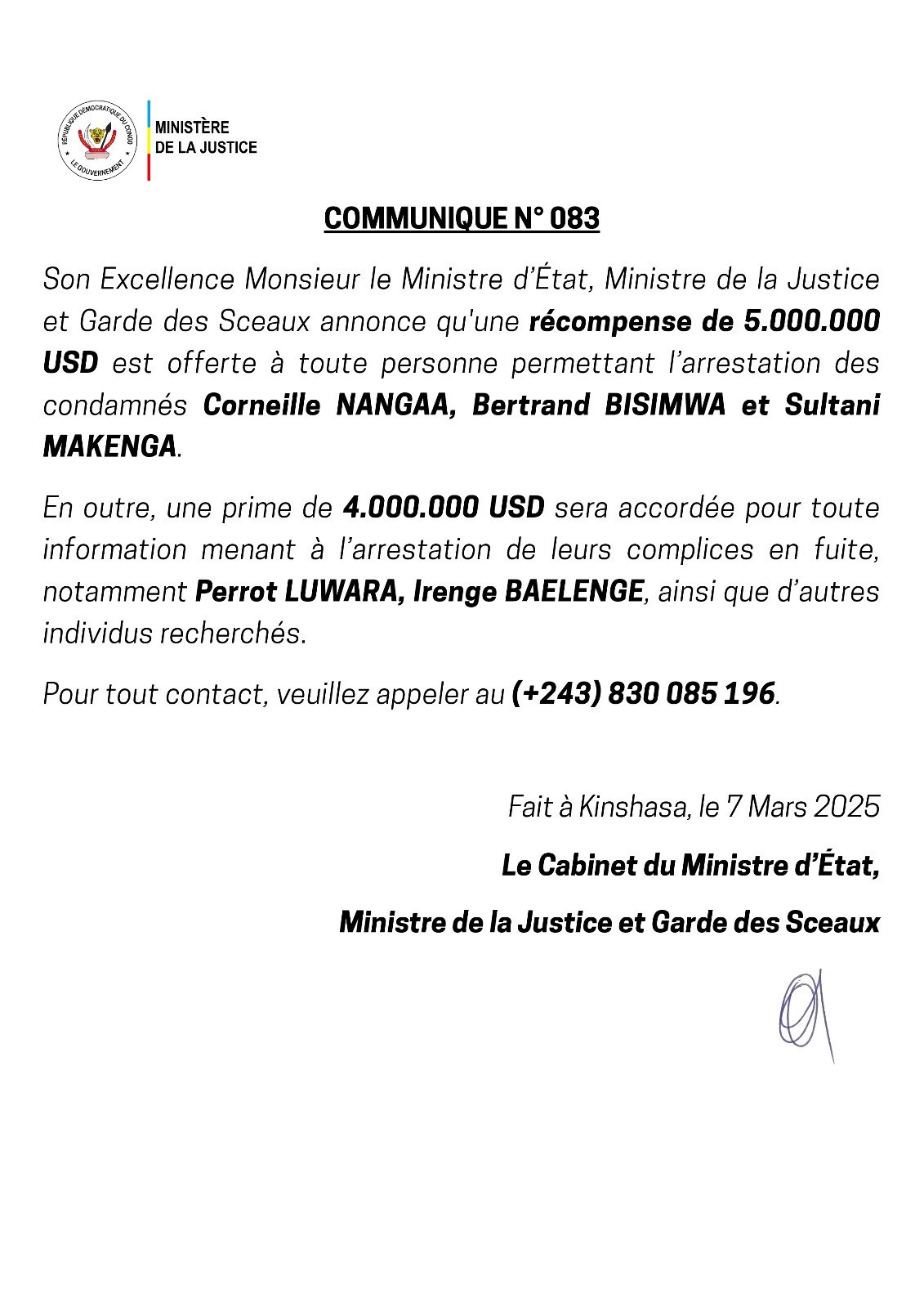Ni itangazo rya Minisitiri w’Ubutabera wa Congo, Constant Mutamba, ryasinywe kuri uyu wa Gatanu tariki ya 7 Werurwe 2025.