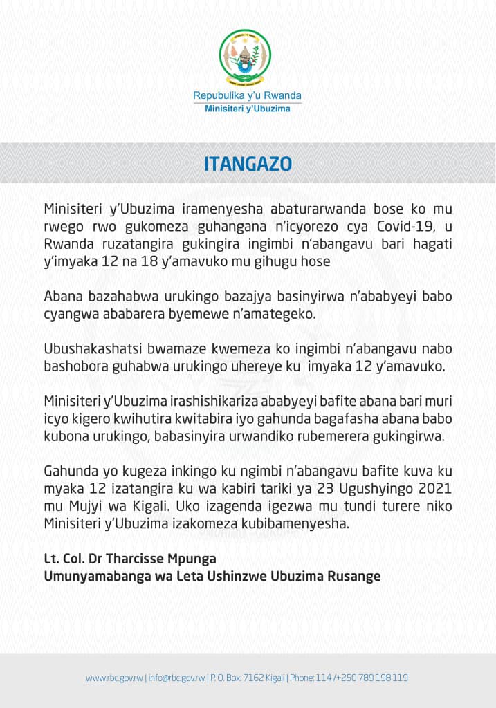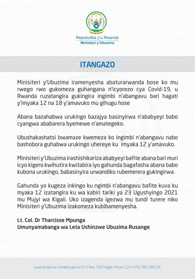 Minisiteri y’Ubuzima yatangaje ko abana bato bafite imyaka guhera kuri 12 y’amavuko nabo bagiye gutangira guhabwa urukingo rwa COVID 19.