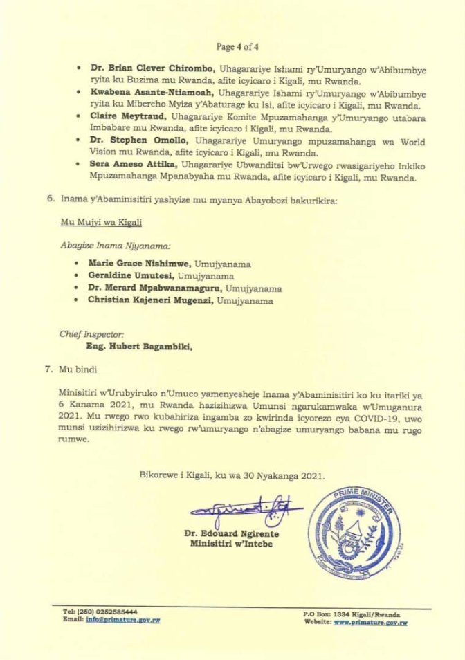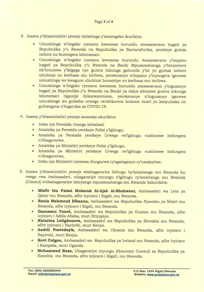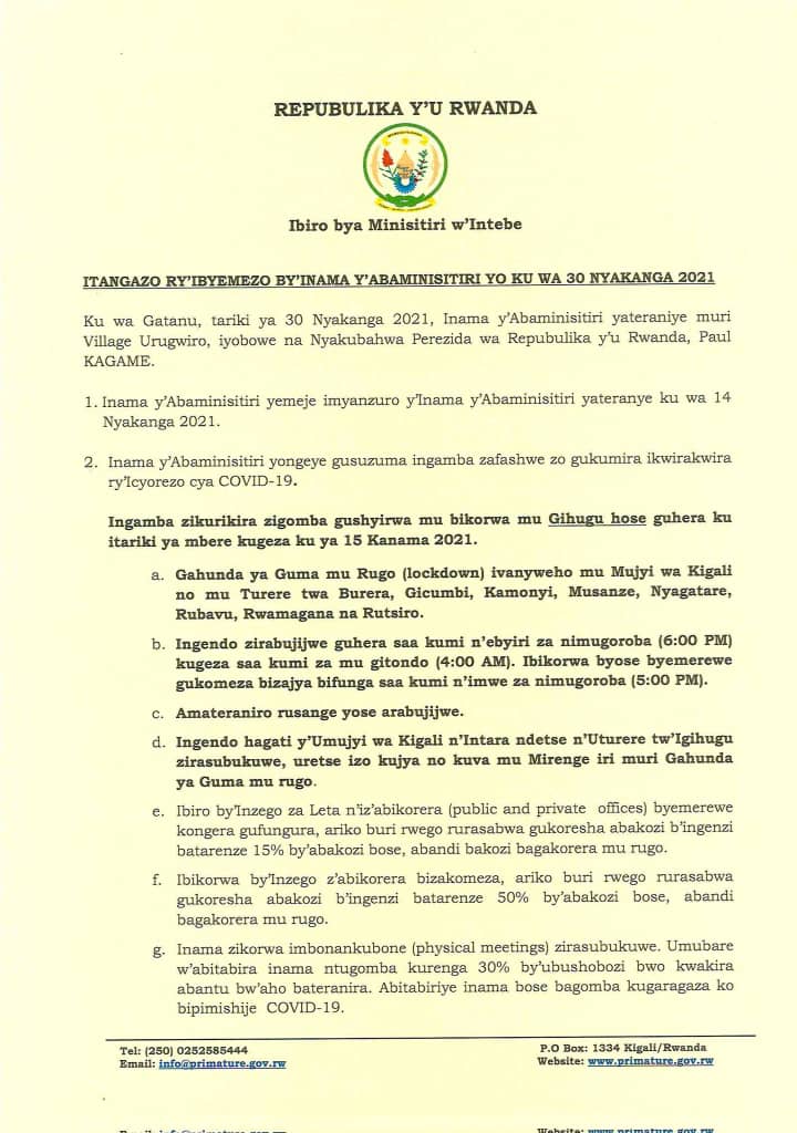Mu myanzuro yayifatiwemo hemejwe ko gahunda ya Guma mu rugo ivanyweho mu Mujyi wa Kigali no mu Turere twa Burera, Gicumbi, Kamonyi, Musanze, Nyagatare, Rubavu, Rwamagana na Rutsiro.