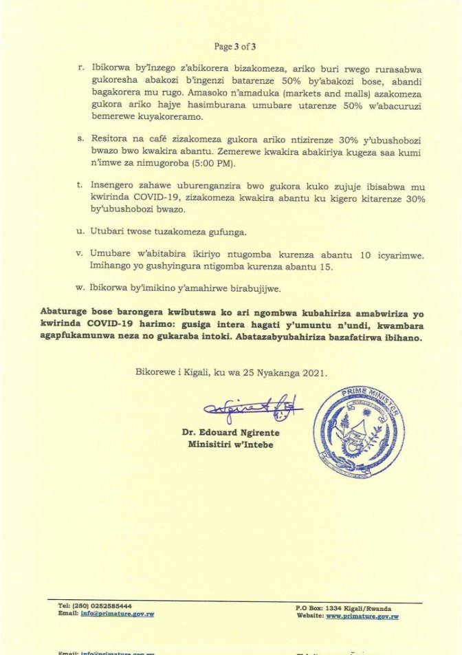 Itangazo riturutse mu biro bya Minisitiri w’Intebe w’u Rwanda kuri iki cyumweru Tariki 25 Nyakanga 2021, riravuga ko ku ngamba zisanzwe za Guma mu rugo mu Mujyi wa Kigali no mu turere umunani, hongeweho iminsi itanu nk’igihe cyo gushyira mu bikorwa ingamba zisanzweho.