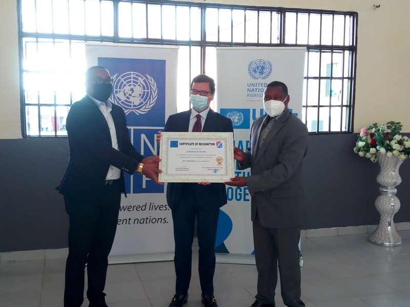 Nyuma yo gusura no kuganira ku mbogamizi zigihari mu kwita ku abfite ubumuga, hatanzwe impamyabushobozi z’ishimwe mu bahagarariye amashami ya Loni n’Uhagarariye Ubumwe bw’uburayi, Bellomo Nicola uri hagati.