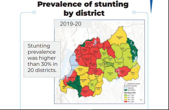 Raporo ya RDHS7 igaragaza ko 27% by’abana bari munsi y’imyaka itanu bagwingira, ugereranyije na 33% byagaragaye mu bushakashatsi bwa DHS 2019/2020. Iri gabanuka rifatwa nk’intambwe ishimishije, rigaragaza ko politiki n’ingamba Leta yashyizeho mu rwego rw’imirire n’ubuzima byatangiye gutanga umusaruro.