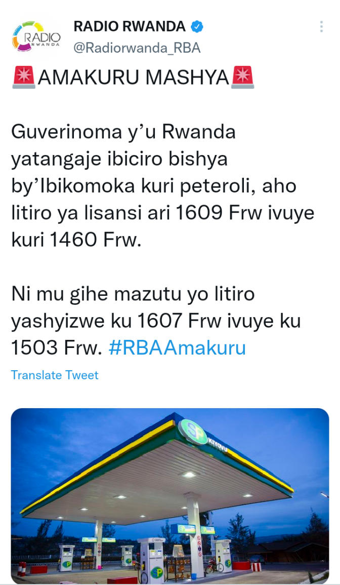 Guverinoma y’u Rwanda yatangaje ibiciro bishya by’Ibikomoka kuri peteroli, aho litiro ya lisansi yageze ku Frw 1609 Frw ivuye kuri 1460 Frw mu gihe Mazutu yageze ku Frw 1607 ivuye ku Frw 1503.