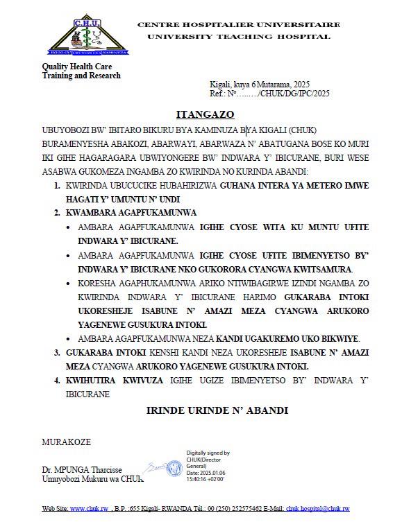 Ikigo cy’Ubuvuzi cya Kaminuza cya Kigali, CHUK, cyashyizeho amabwiriza asaba abahashakirs serivisi zitandukanye kwitwararika ku ndwara y’ibicurane bikabije yadutse.
