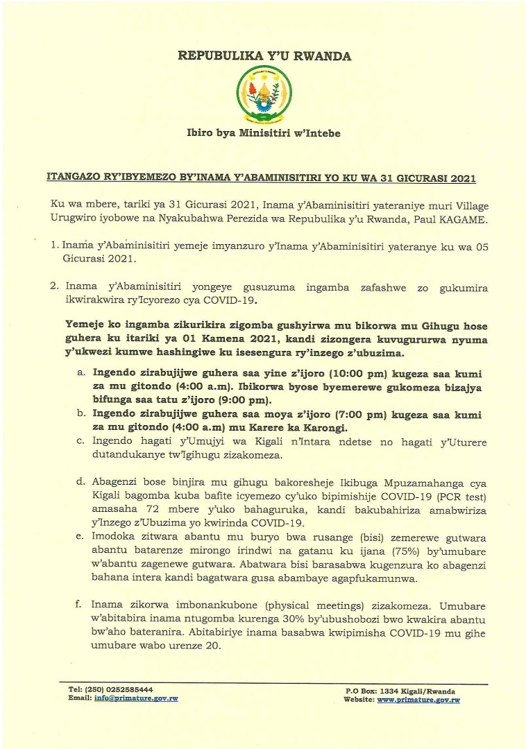 Ibyemezo by’Inama y’Abaminisitiri yateranye ku mugoroba wa tariki ya 31/5/2021 iyobowe na Perezida Paul Kagame birimo ko Imihango yo gusaba ndetse no kwiyakira bijyanye n’ubukwe birasubukuwe.