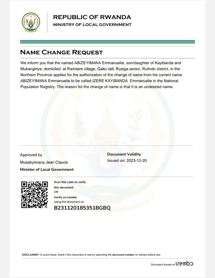 Itangazo ryo guhinduza amazina