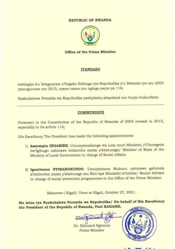Byasohotse mu itangazo rishyizwe hanze n’ibiro bya Minisitiri w’Intebe ku mugoroba wo kuri uyu wa Gatatu tariki ya 27 Ukwakira 2021.