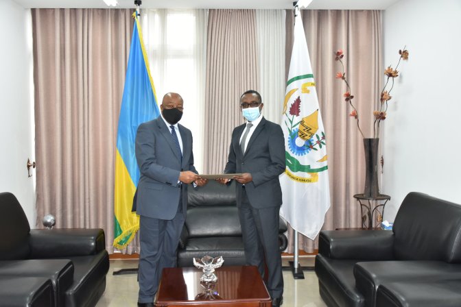 Designate Mandisi Bongani Mabuto Mpahlwa yagejeje impapuro zimusabira guhagararira Afurika y’Epfo mu Rwanda, azishyikiriza Minisitiri w’Ububanyi n’amahanga w’u Rwanda, Dr. Biruta Vincent mu biro bye.