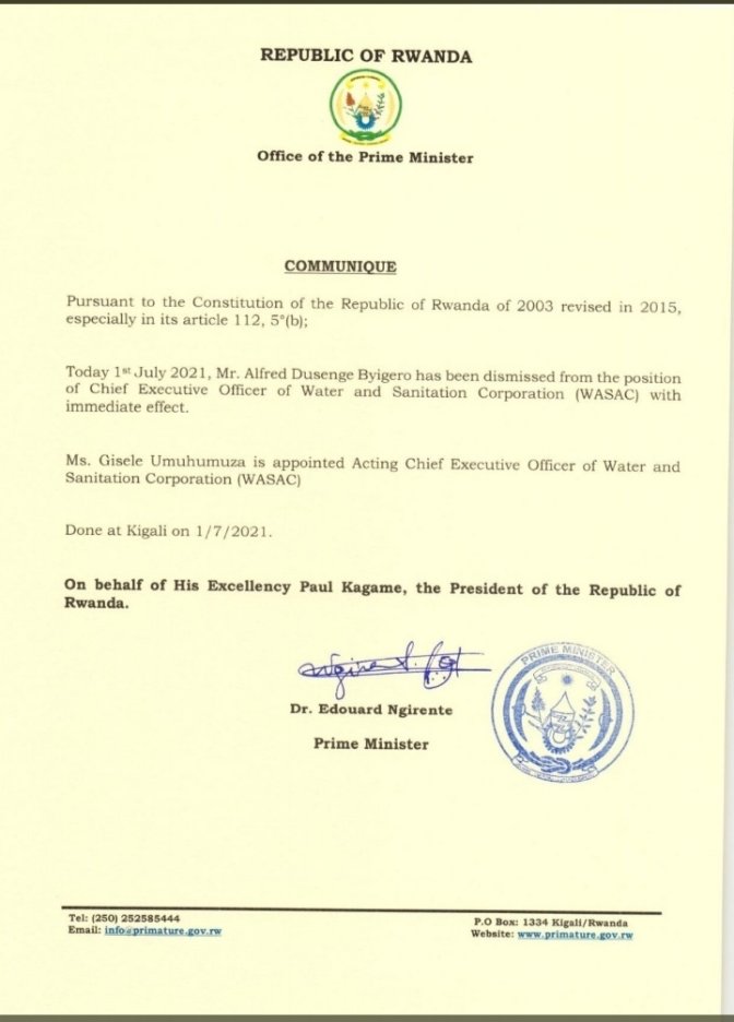 Minisitiri w’Intebe Dr Edouard Ngirente yatangaje ko, mu izina rya Perezida wa Repubulika Paul Kagame, Dusenge Alfred Byigero wari Umuyobozi Mukuru w’Ikigo gishinzwe Amazi, Isuku n’Isukura (WASAC) yirukanywe kuri iyo mirimo.