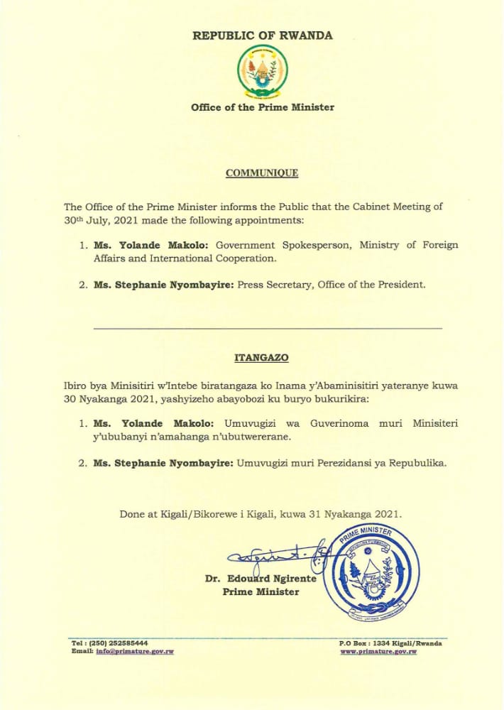 Perezida Kagame yashyizeho umuvugizi mushya wa Guverinoma y’u Rwanda muri Minisitiri w’Ububanyi n’Amahanga n’Ubutwererane, Yolande Makolo, uhawe inshingano Nshya zihariye kuko zakorwaga n’uwabaga ari Minisitiri w’Ububanyi n’Amahanga n’Ubutwererane.