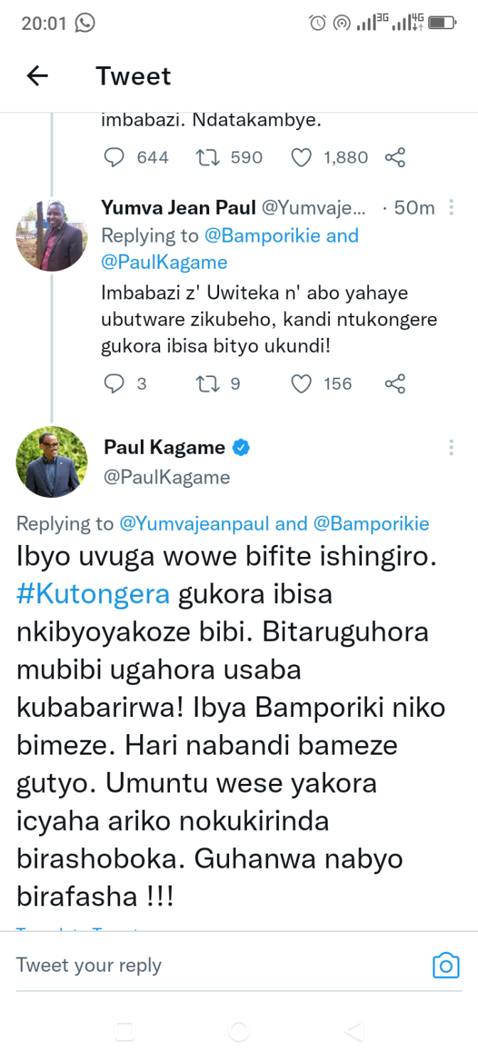 Perezida Kagame yagize ati, "Ibyo uvuga wowe bifite ishingiro. #Kutongera gukora ibisa nkibyoyakoze bibi. Bitaruguhora mubibi ugahora usaba kubabarirwa! Ibya Bamporiki niko bimeze. Hari nabandi bameze gutyo. Umuntu wese yakora icyaha ariko nokukirinda birashoboka. Guhanwa nabyo birafasha !!!"