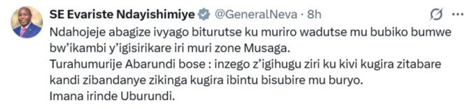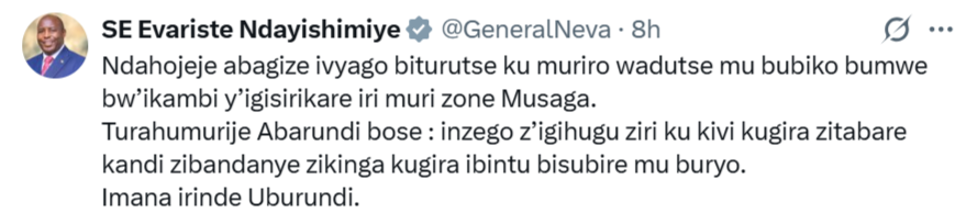 Ati “Nihanganishije abagize ibyago biturutse ku muriro wadutse mu bubiko bumwe bw’ikigo cya gisirikare iri muri Zone Musaga. Duhumurije Abarundi bose: Inzego z’igihugu ziri gukora ibishoboka byose kugira ngo zitabare kandi zikomeje kurinda ubusugire mu buryo. Imana irinde u Burundi.”