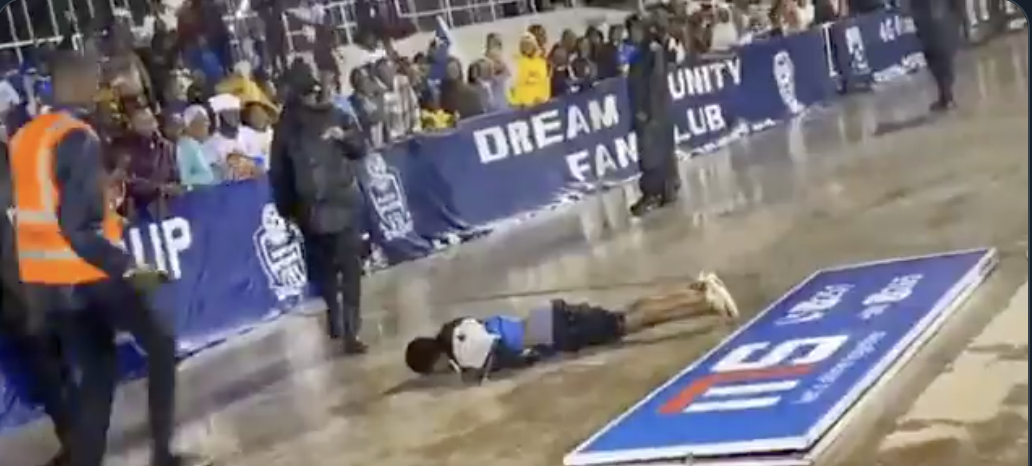 Amashusho yakwirakwijwe ku mbuga nkoranyambaga yerekana umufana wiruka ava mu kibuga uwo ushinzwe umutekano wo ku kibuga akamutega akaguru undi akagwa hasi inyuma y’ibyapa byamamaza kuri Kigali Pele Stadium.